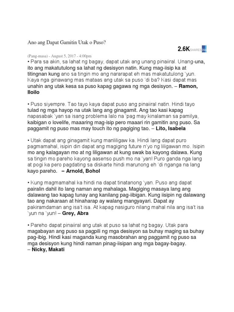 Nasa sa iyo na ang desisyon ngunit ipapaalala ko sayo na lagi nating piliin kung alin ang mas. Ano mas mahalaga PUSO o ISIP. ANGAS NG BAE Pang-masa - August 5 2017 - 400pm Para sa akin sa lahat ng bagay dapat utak ang unang pinaiiral.