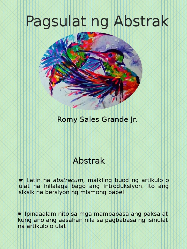 Kailangan na progresibo at abante ang pag gamit. Ano Ang Kahulugan Ng Abstrak. Sa pagsulat ng abstrak ng papel-pananaliksik mahalagang lagumin lamang ang pinakapaksa nito mula sa naging kahalagahan at naging implikasyon ng pag-aaral.