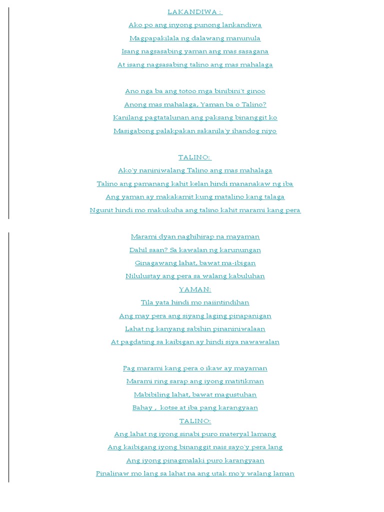 Ako po ang inyong punong lakandiwa Magpapakilala ng dalawang manunula Isang magsasabing yaman ang mas sasagana At isang nagsasabing talino ang mas mahalaga Ano nga ba ang totoo mga binubinit ginoo Anong mas mahalaga Yaman ba o talino Kanilang pagtatalunan ang paksang binanggit ko Masigabog palakpakan sakanilay ihandog niyo TALINO. Paksang aking ilalatag pakiwariy mahalaga. Ang tunay na karunungan ay bunga ng kabanalan na mahigit pa sa anumang kayamanan.