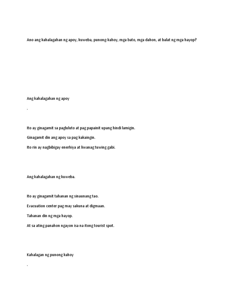 Apoy kuweba punong kahoy mgabato mgadahon balatnghayop. Bakit mahalaga sa mga sinaunang tao ang mga punong kahoy mgabato balat ng hayop apoy kuweba. Ang apoy ay naging mahalaga dahil ginagamit ito noon para makapagluto ng pagkain nagbibigay init sa kanila kapag malamig at para magsisilbing ilaw kapag gabi na.