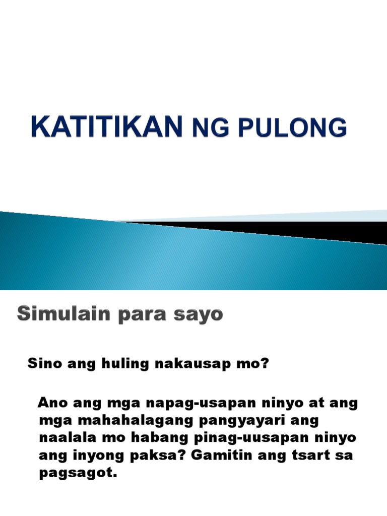 1 question Bakit mahalaga ang isang katitikan ng pulong. So para mas ma-gets mo sa wikang Ingles tinatawag itong minutes of meeting. Mahalagang magtala o magsulat ng katitikan ng pulong sapagkat dito nakasaad ang mga napag-usapan sa pagpupulong.