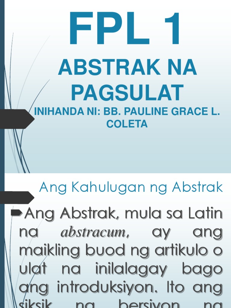 Ang Abstrak ay isang uri ng lagom na karaniwang ginagamit sa pagsulat ng mga akademikong papel tulad ng tesis papel na siyentipiko at teknikal lektyur at mga report. Ang mga nakaengganyong pagsali sa mga esports ay isang dahilan kung bakit estudyante at bumababa ang marka. Bakit kailangan ng abstrak.
