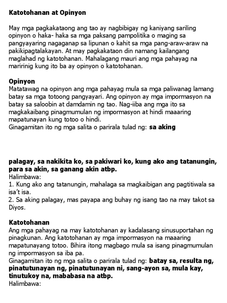 Ang opinyon ko ay mahalaga dahil. Kadalasan gumagamit ng mga pananda ang mga opinyon upang malaman na ito ay pansariling pagtingin o. At kung ang isang tao ay nangangailangan ng isa pang walang tanung-tanong sumasang-ayon sa kanya at pagkatapos ay wala nang friendship ngunit tunay na pagkaalipin.
